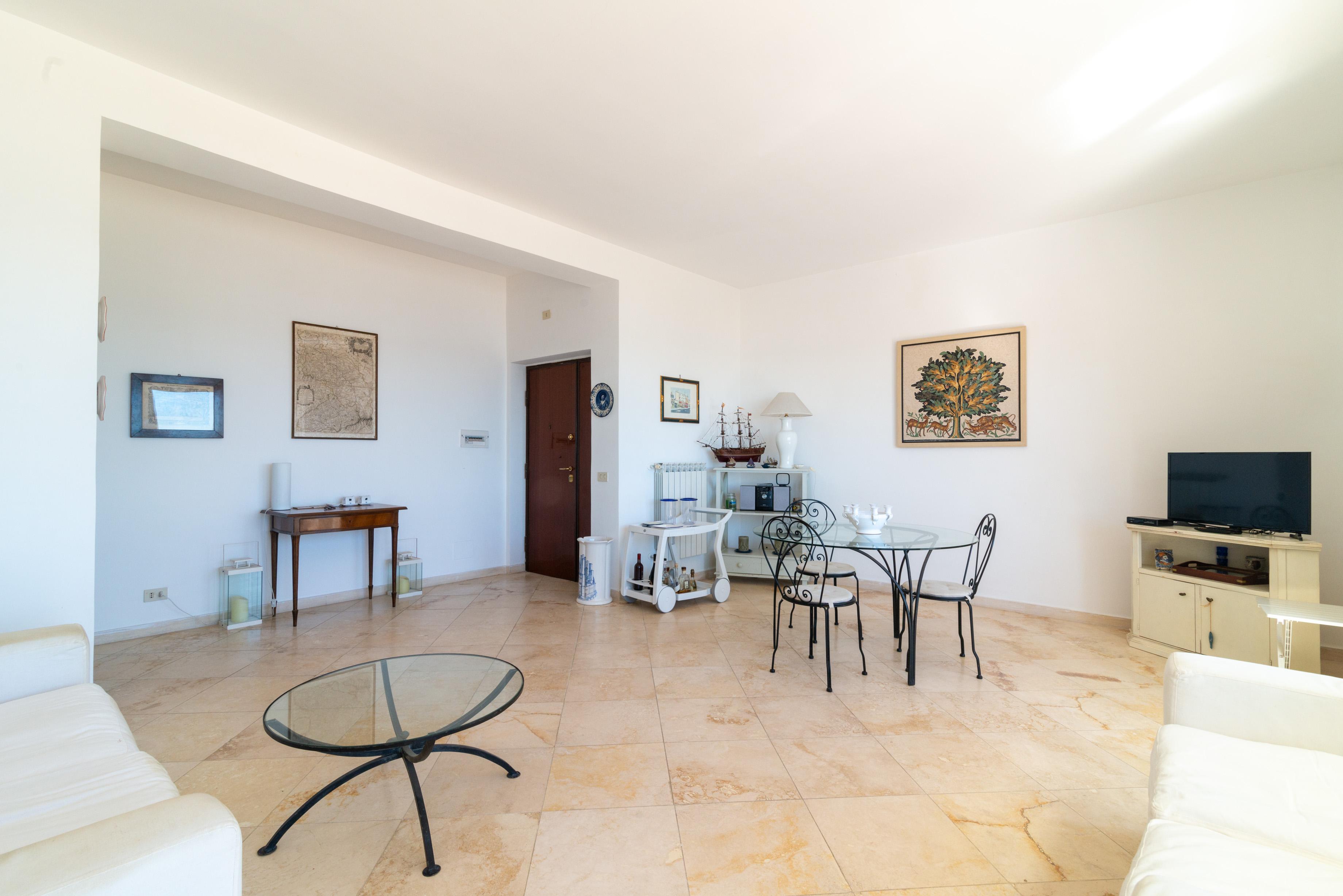 Varcato l’ingresso si accede direttamente all’ampio soggiorno con zona pranzo, dotato di grandi finestre e porte finestre che conducono al terrazzo.