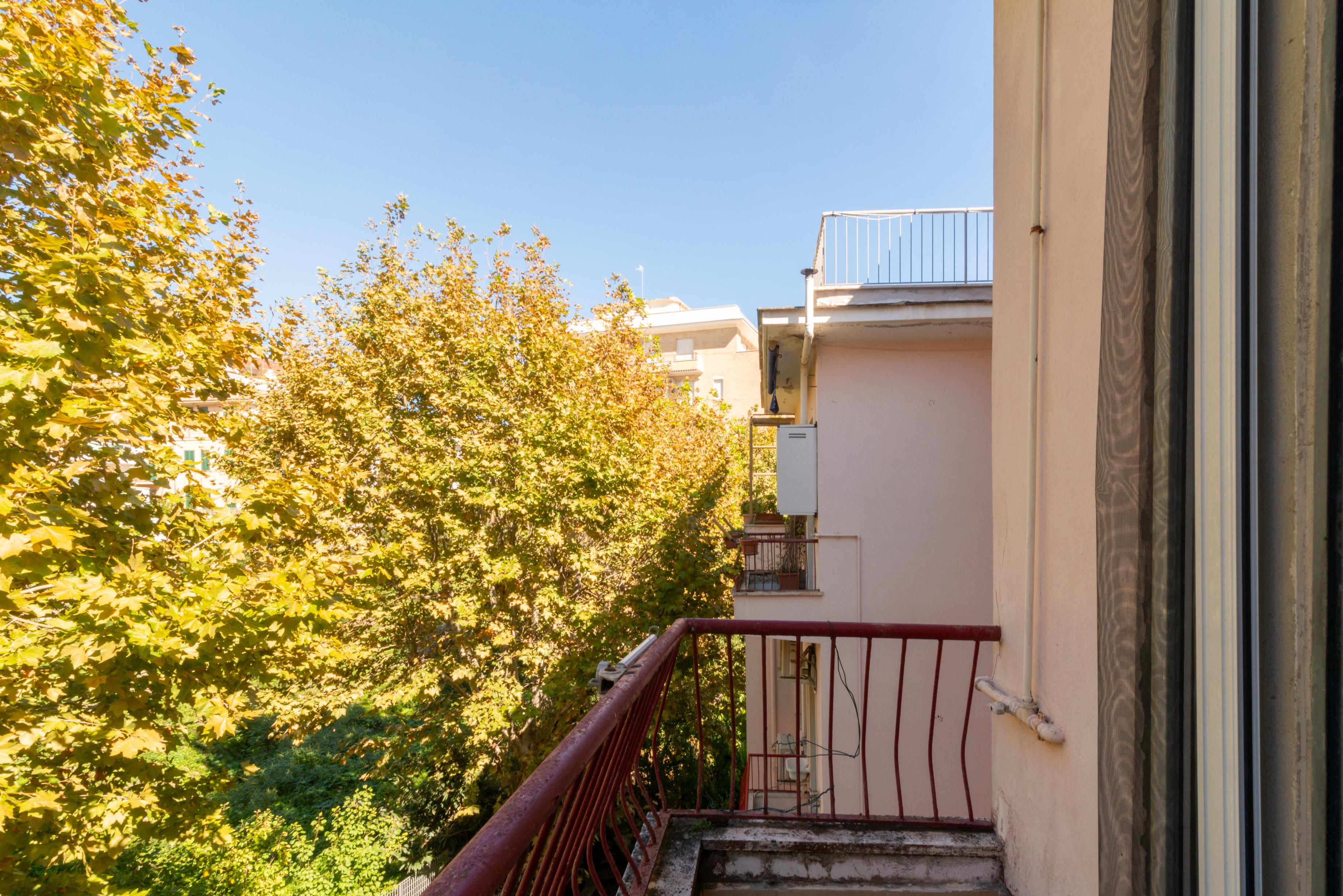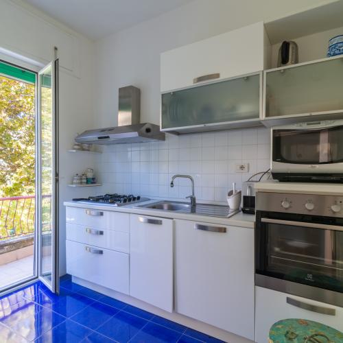 Dal corridoio possiamo invece raggiungere la seconda camera da letto anch’essa con porta finestra sul terrazzo principale, la cameretta, gli altri due bagni, tutti finestrati, e la cucina abitabile con balcone.